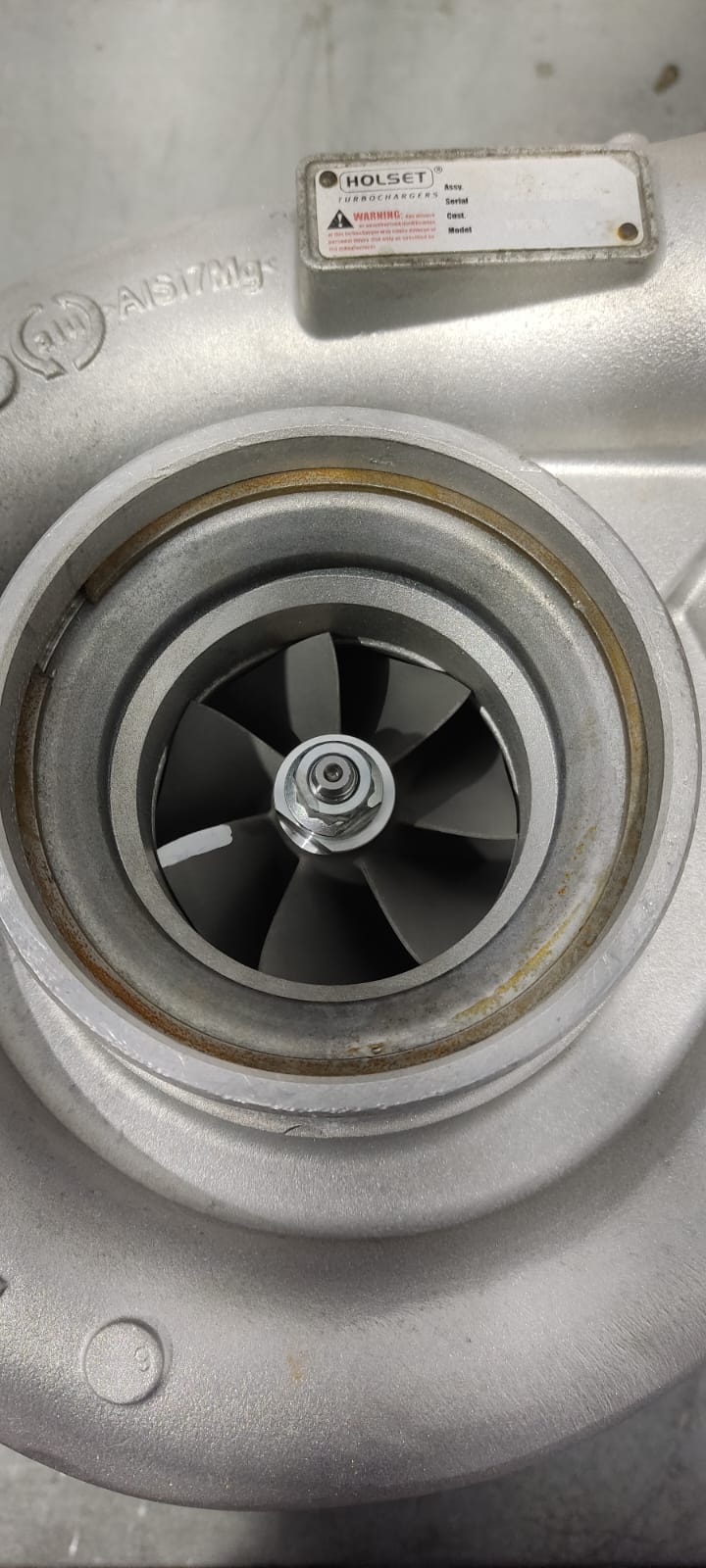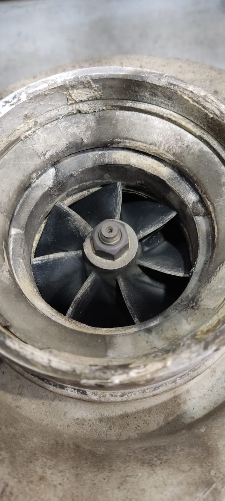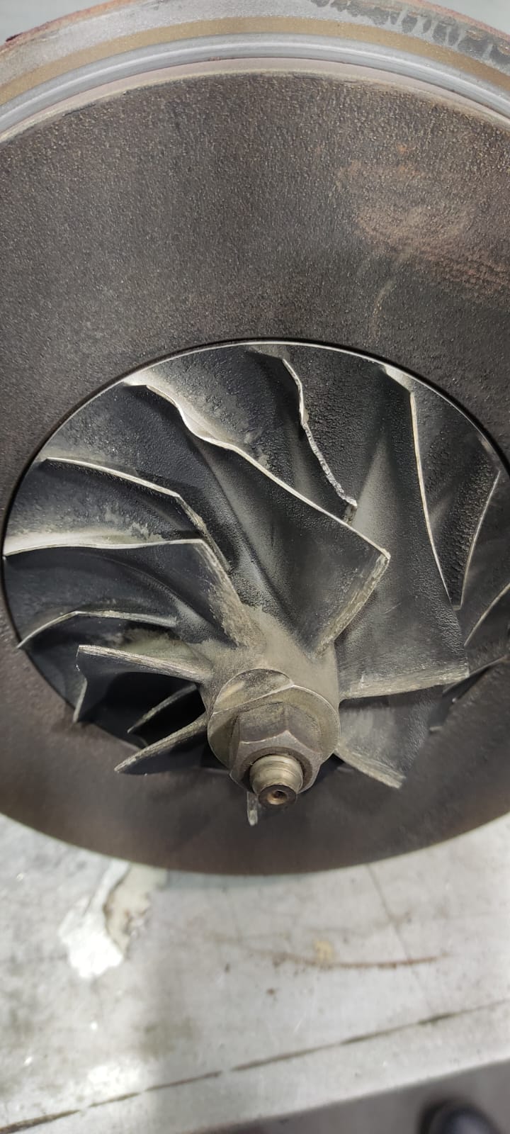 Жалоба на свист при наддуве. При дефектовке выявлено попадание по компрессорному колесу из-за попадания постороннего предмета (резиновый уплотнитель воздушного фильтра), закоксованность и абразив на втулках скольжения. Заменены детали вращения, отбалансирована и проверена герметичность на стенде.